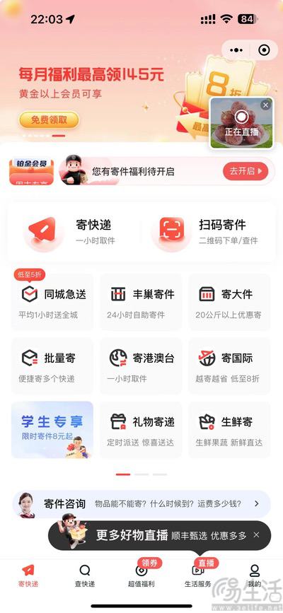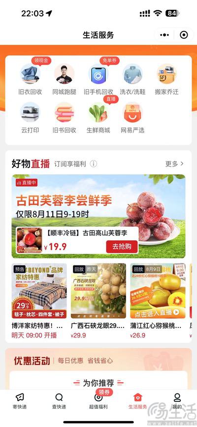 此外值得一提的是,顺丰直播间还与丰巢部分业务打通,用户可通过“生活服务”这个一级入口进入生鲜商城,以及下单旧手机/旧衣/旧书回收、洗衣/洗鞋、云打印等服务。