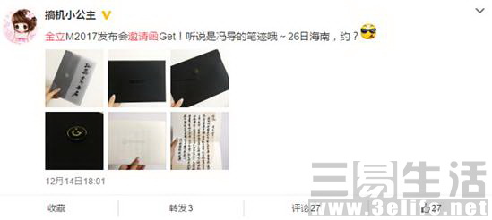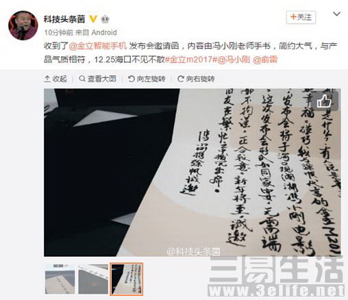 最近,金立高端旗舰手机M2017即将发布的信息备受瞩目,据了解,该机将于12月26日,在海口观澜湖冯小刚电影公社发布。而近日,有网友爆出了一封由冯小刚亲自书写的发布会邀请函,显示金立M2017将以“家宴”的形式举办发布会。而这封冯小刚亲自手写的“家书”,也展示了金立的诚意及这款手机的人文内涵。