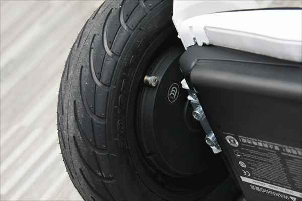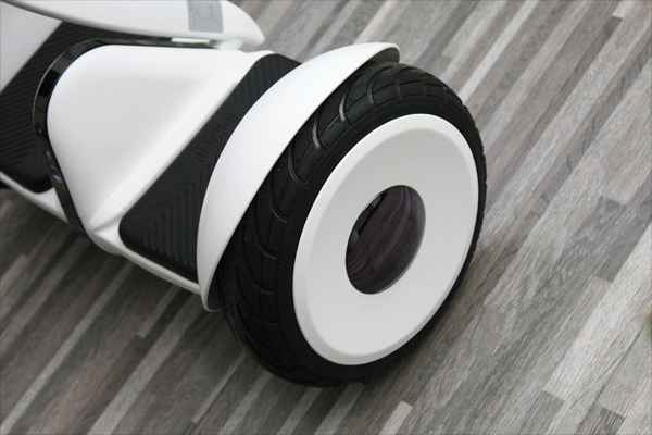 视线转到车侧,巨大的轮毂可以说是电动平衡车的招牌外观组成部分,因为电动车本身依靠置于轮毂中的电动机驱动和转向。顺带一提的是,出于保证舒适性和通过性的设计,九号平衡车使用了来自米其林技术的充气轮胎,因此轮毂内侧隐藏了轮胎充气口。