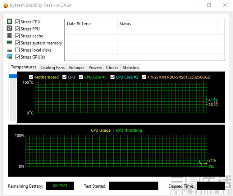 笔者使用AIDA64自带的系统稳定性测试工具对Acer S13的CPU、浮点单元、缓存单元、内存和显卡全部满载运行,将整台电脑置于极端的性能压力下以考验其散热能力。可以看出,全满载的压力确实是巨大的,两个CPU内核一个达到了88摄氏度,另一个也有79摄氏度,软件发出了过热警报,CPU的睿频幅度也自动限制了。